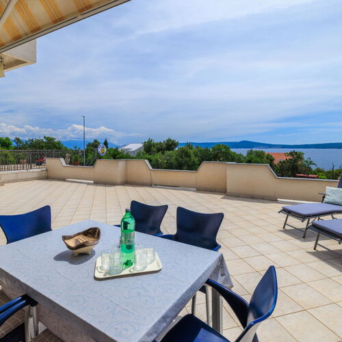 Közös terasz, tengerre néző kilátás, ülőgarnitúra, nyugágyak, terasz mérete: 45 m²