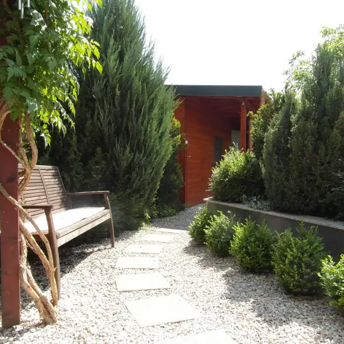 Egy szoba a kertben... Ezt kínáljuk Önnek Gyulán, az Alföld legszebb kisvárosában. Ha szeretne reggel madárcsicsergésre ébredni, kávézás közben a fedett teraszról gyönyörködni a harmatos kerti növényekben, megfigyelni a feketerigókat vagy cicák játékát a füvön, este pedig a sünök mozgolódását nézni, akkor a szálláshelyünk a legjobb választás. A csendes környéken, de a vártól és a fürdőtől csak néhány perces sétára található családi házunk parkosított és díszmedencével rendelkező kertjében külön bejáratú, teljesen elkülönített vendégházunkba szeretettel várjuk Önt és családját. Az egylégterű szobában egy franciaágy és egy kétszemélyes kihúzható kanapé biztosít legfeljebb négy főnek kényelmes elhelyezést. Az apartman teljesen felszerelt konyhával rendelkezik, vízforraló, elektromos főzőlap, kenyérpirító, edények és evőeszközök állnak rendelkezésre, négyszemélyes étkezőasztal és privát terasz nyújt lehetőséget az étkezésekre. A fürdőszoba zuhanyzóval és elektromos vízmelegítővel felszerelt, hajszárító és mosógép használata is lehetséges. Az apartman berendezése modern és új, igényesen és praktikusan felszerelt. A kertben lehetőség van gyerekjátékok használatára, az összefüggő zöld felület a kicsiknek is kikapcsolódást biztosít. A családok mellett párokat is szívesen látunk kerti szobánkban. Reméljük, Önt is vendégeink között köszönthetjük!